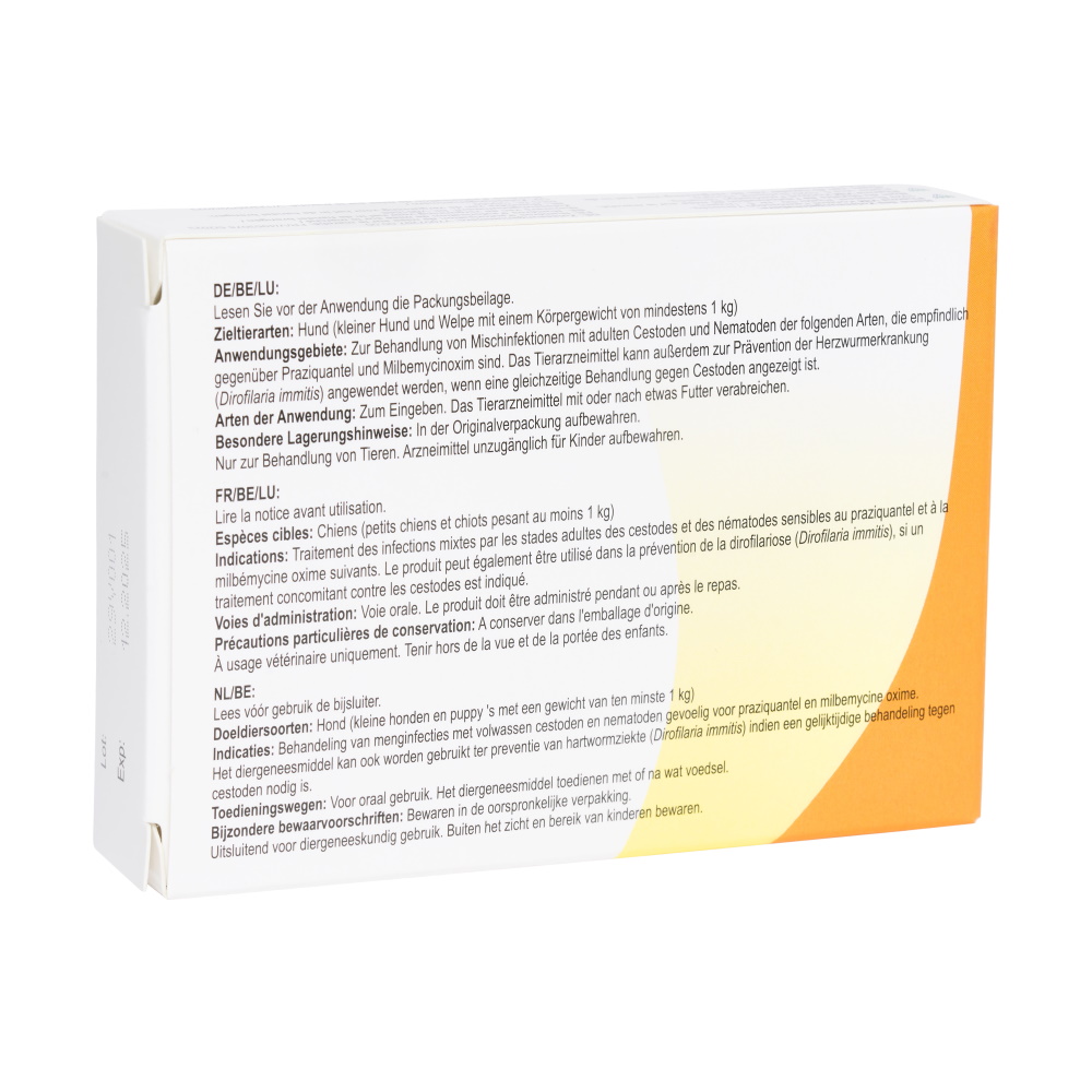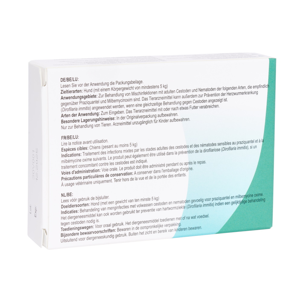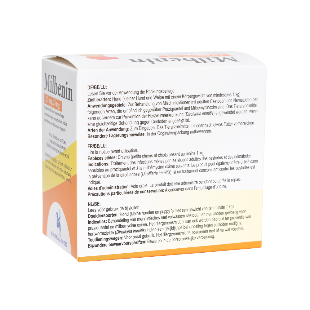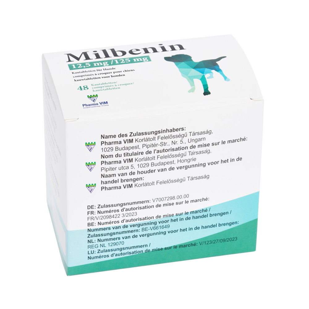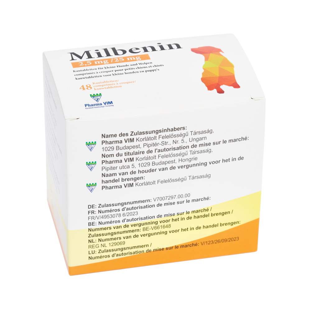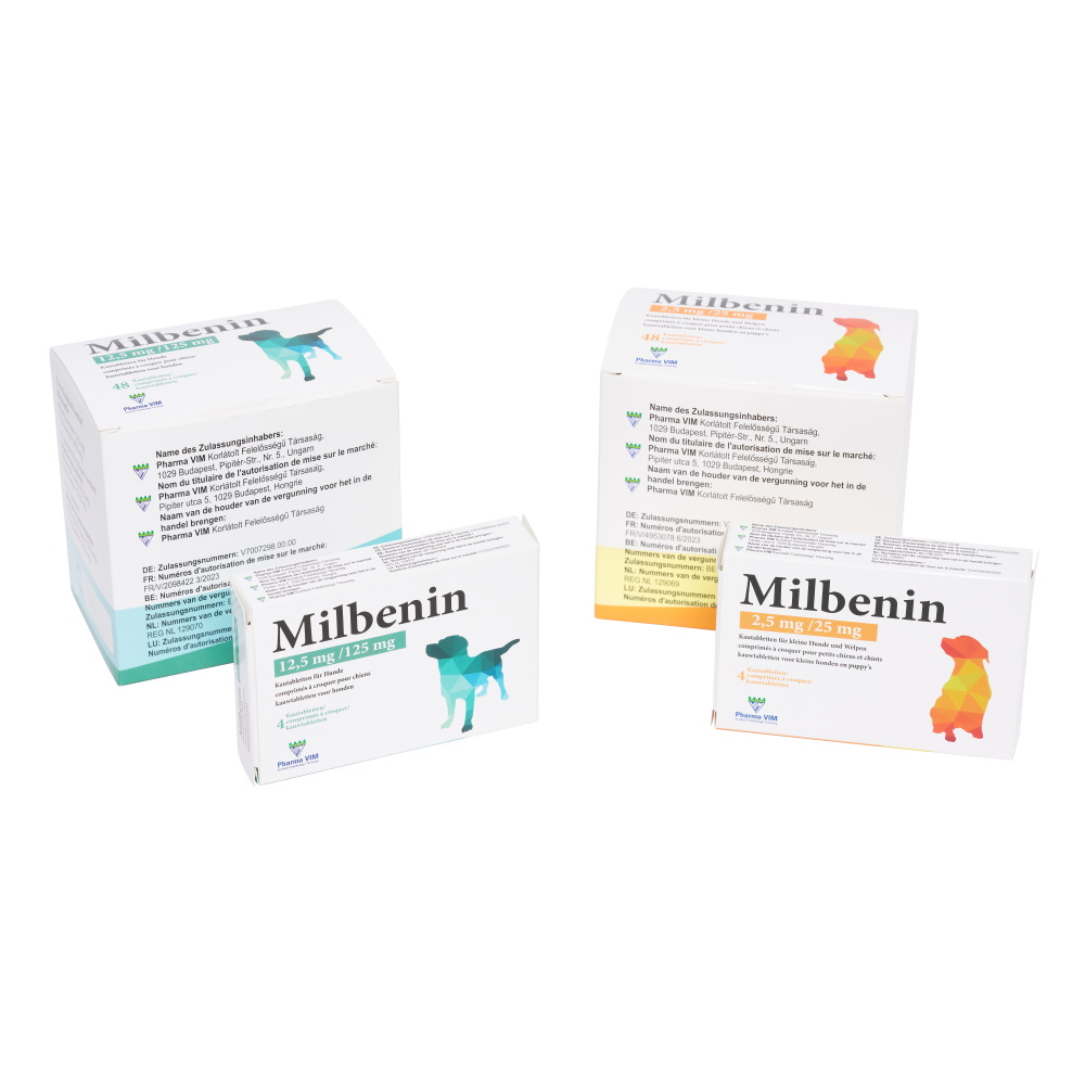 Milbenin chewable tablets are available for small dogs and puppies (suitable for dogs weighing 1-5 kg and/or older than 2 weeks) and for large dogs (suitable for dogs weighing >5 kg).