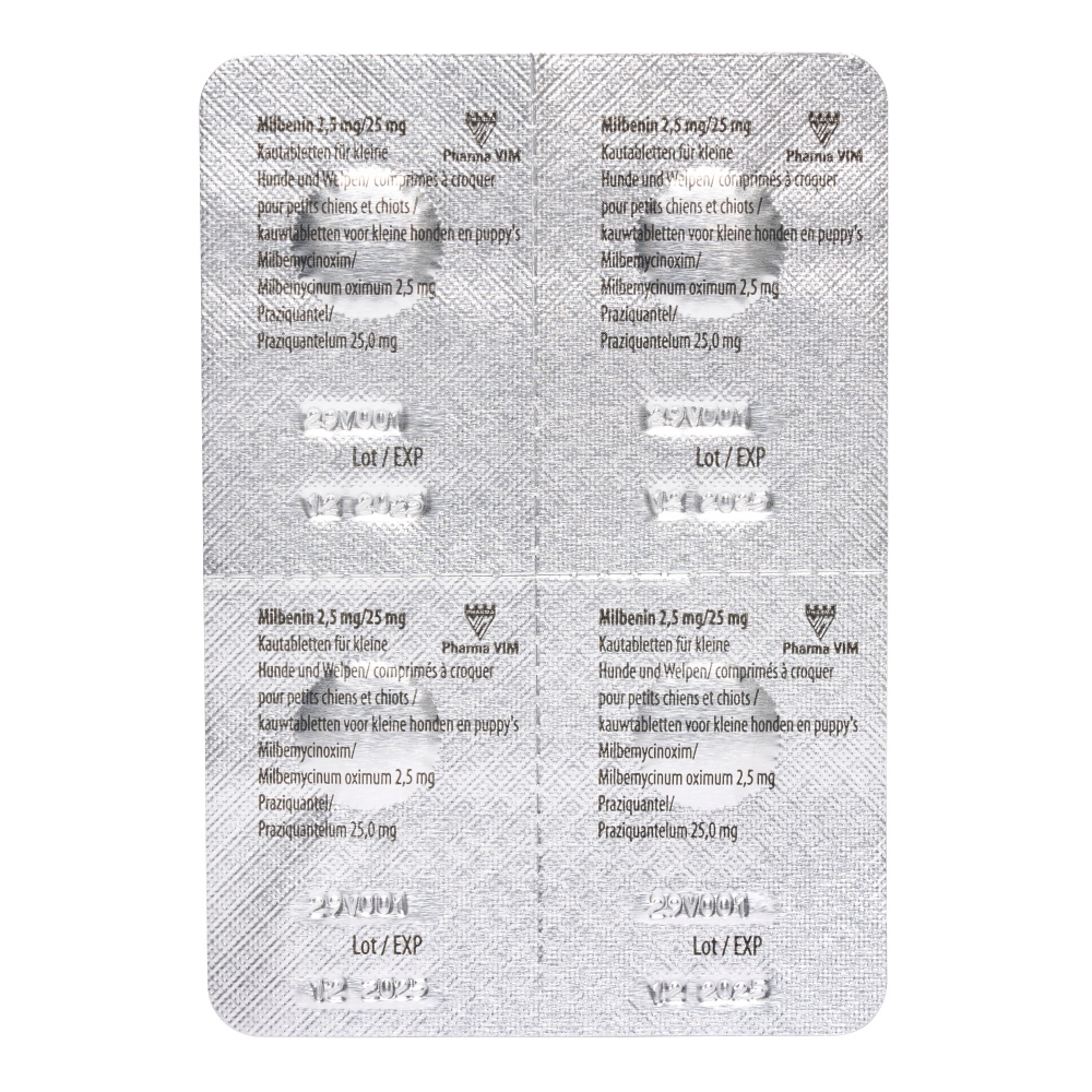 Milbenin contains the active substances Milbemycin oxime and Praziquantel. These active substances are also found, for example, in Milpro dog, Milprazon dog, Milbemax dog and Milbactor dog.