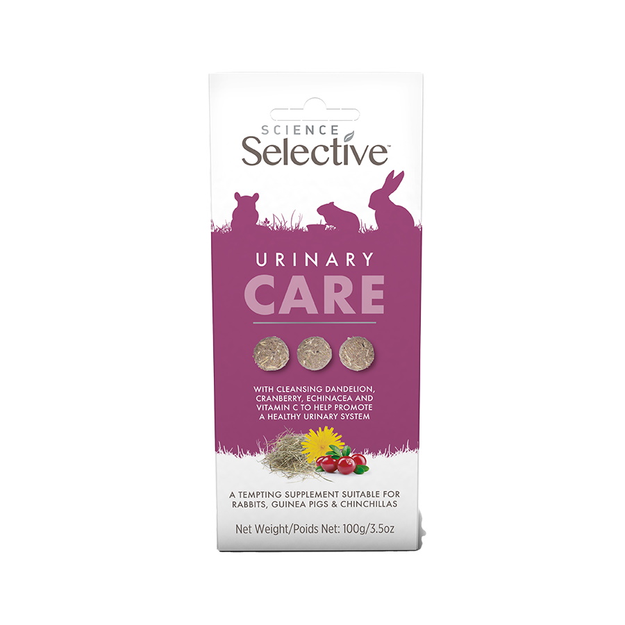 Science Selective Urinary Care sind Ergänzungsfuttermittel für Kaninchen, Meerschweinchen und Chinchillas. Sie unterstützen ein gesundes Immunsystem und enthalten reinigenden Löwenzahn, Cranberry, Echinacea und Vitamin C.